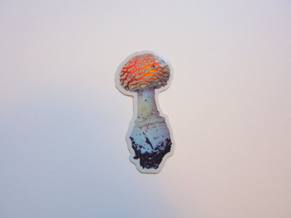 This listing is for one holographic sticker featuring the notoriously cute Amanita muscaria mushroom in its early stages! Stickers are made from mushroom photographs I took along the California coast. This is holographic on its red cap and opaque on the stem and white warts. This sticker is 2.5in (6.5cm) at its longest measurement. Stickers are printed on high quality durable material that is 2-4 year weatherproof. Suitable for cars, dishwashers, skateboards, sewing machines, microscopes, tool boxes, journals, laptops, phone cases, love letters, musical instruments, and any other surface you can think of!