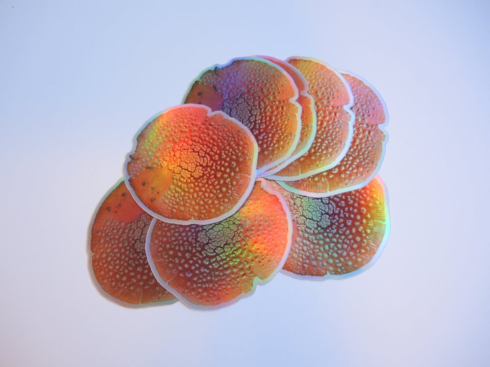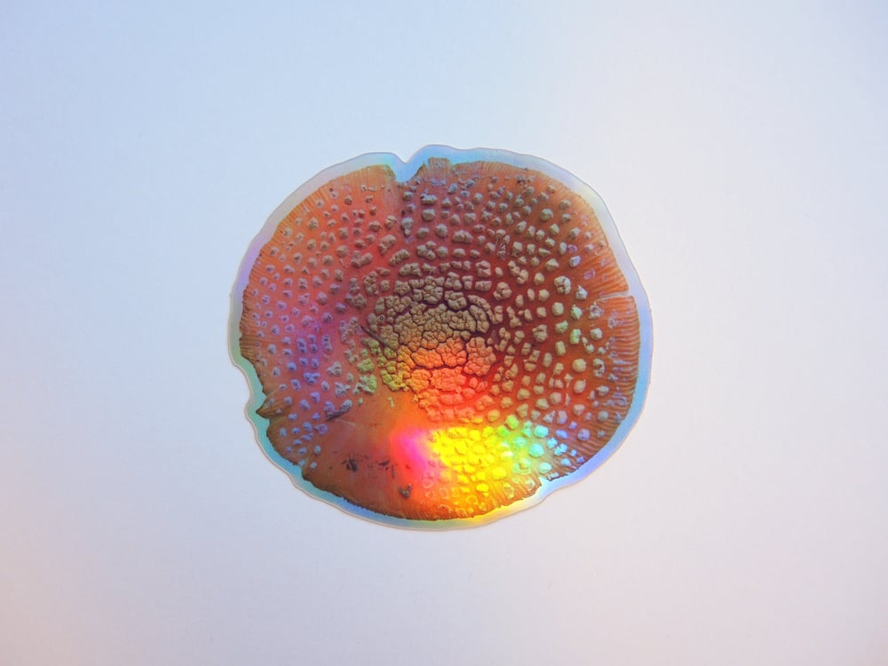 This listing is for one holographic sticker featuring the cap section of the notoriously cute Amanita muscaria mushroom! Stickers are made from mushroom photographs I took along the California coast. This is holographic all over and opaque on its white warts. This sticker is 2.5in (6.5cm) at its longest measurement. Stickers are printed on high quality durable material that is 2-4 year weatherproof. Suitable for cars, dishwashers, skateboards, sewing machines, microscopes, tool boxes, journals, laptops, phone cases, love letters, musical instruments, and any other surface you can think of!